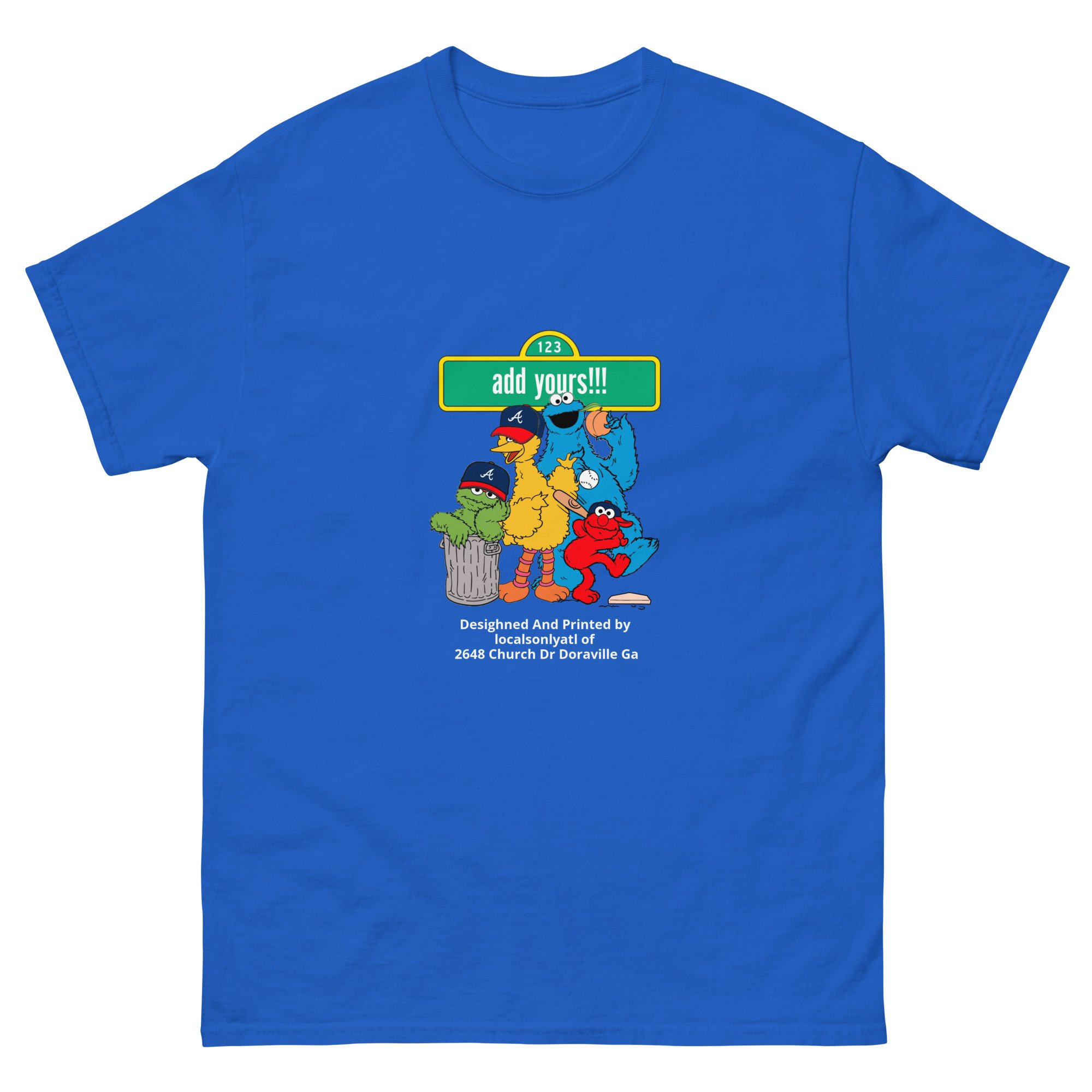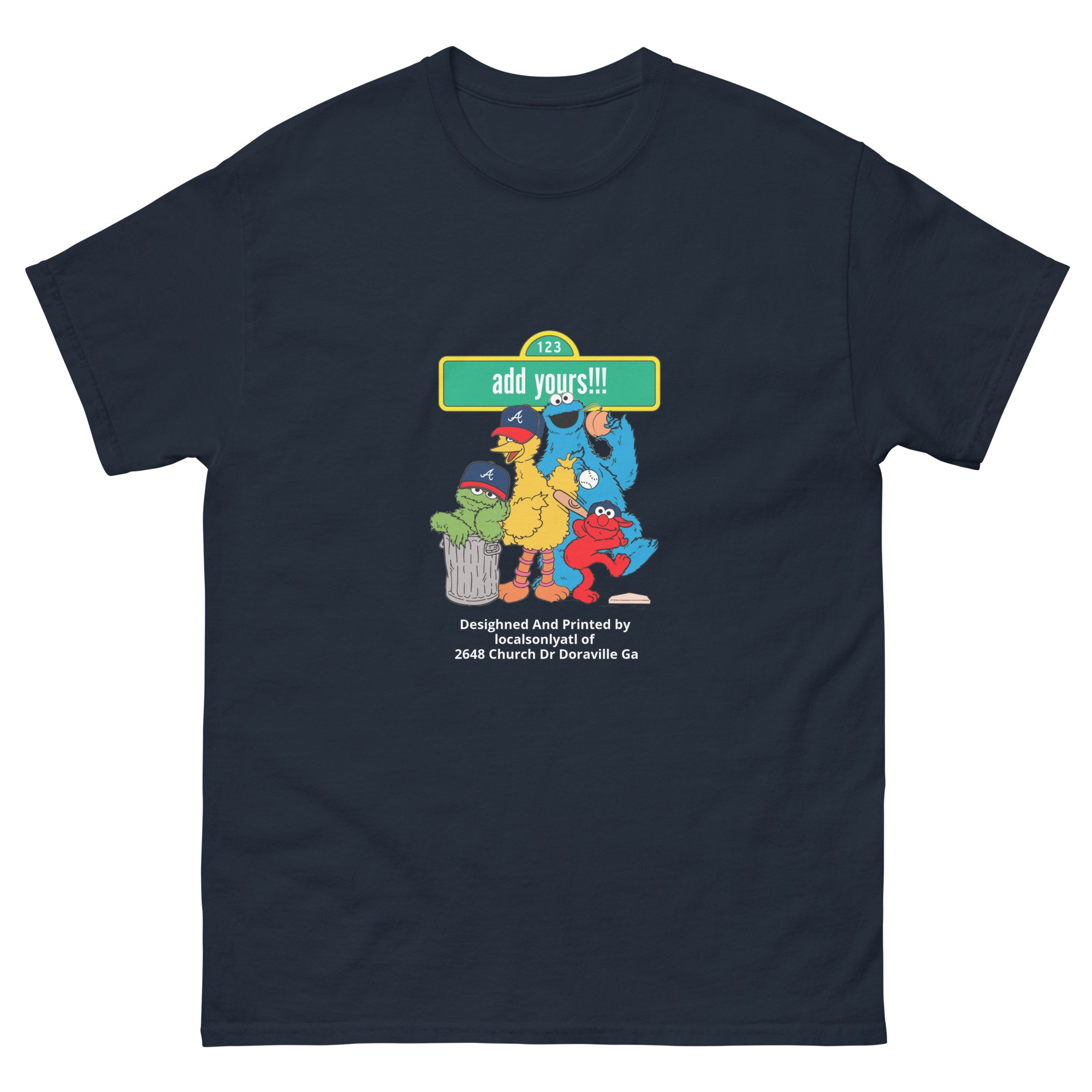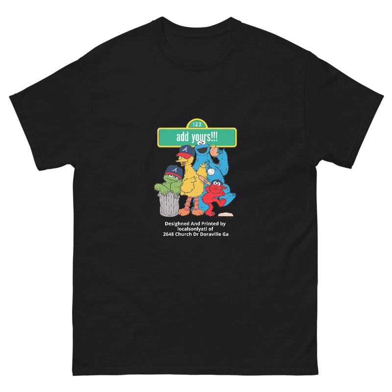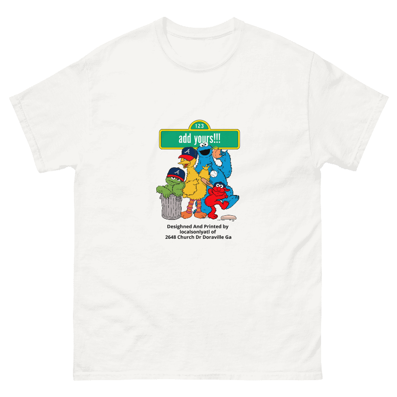 A playful Atlanta remix of a childhood classic. The Sesame Street ATL tee brings nostalgia and hometown pride together — featuring your favorite streetwise crew rocking Braves caps and repping the city with a custom street sign you can make your own.